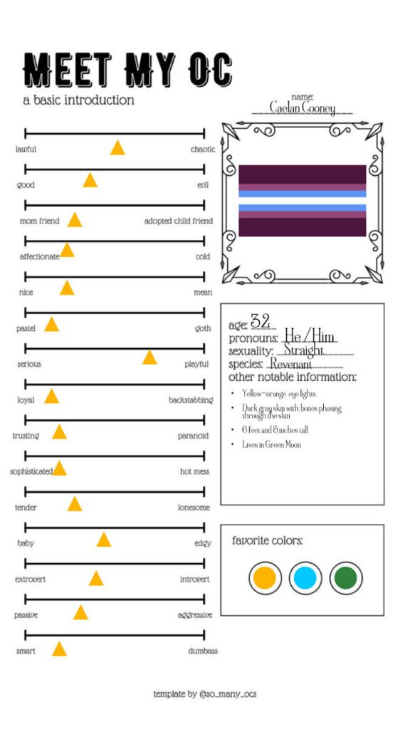 Physical Description: He stands at 6’5 and has yellow-orange eye lights. Wears hippy, stoner, and chill gender non-conforming clothes. Caelan has dark gray skin with white bones poking through, revealing a skull-like face, knuckles, and a rib cage that appears to be sitting on top of the skin.